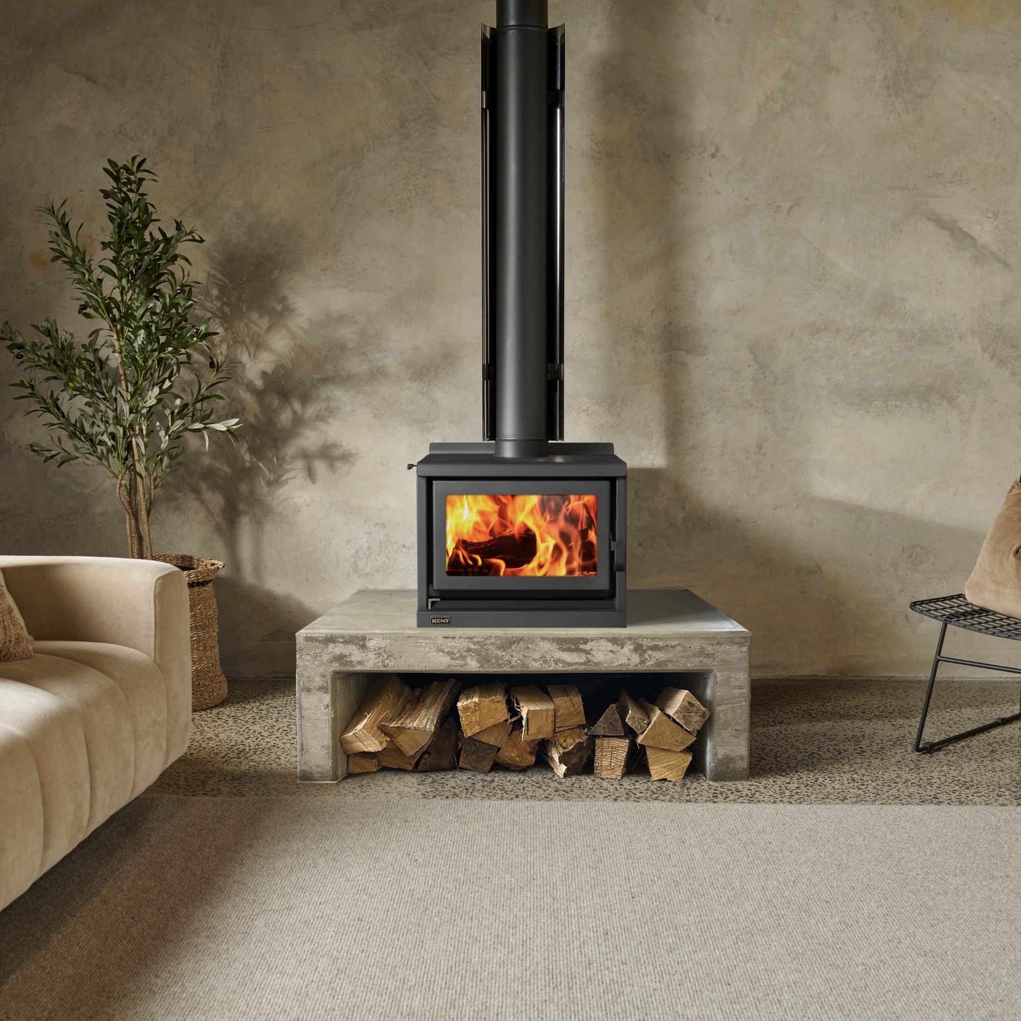 The Kent Forbes is a unique 18kW bench-top wood fireplace delivering efficient, clean-air heating for three or four-bedroom homes. Capable of heating up to 210m², it sets the scene for warm, cosy winter evenings.